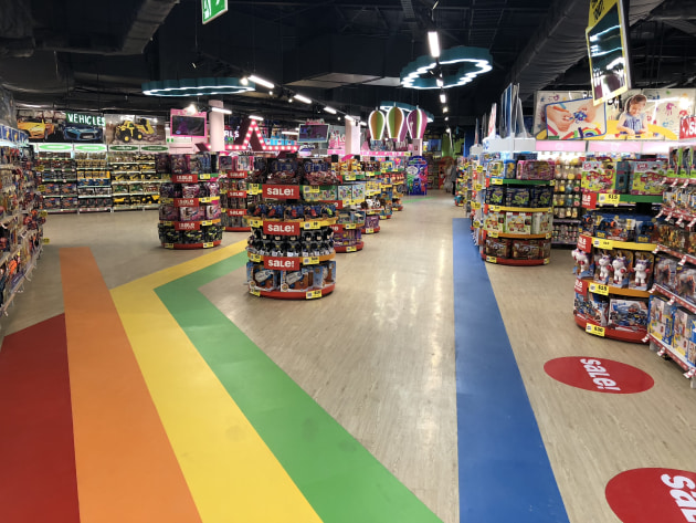 The floors also feature decals which tie into the 'world' that the floor navigates through. The vehicles section features a racetrack and the games section hosts game board decals. In other areas, the floor is rainbow, to mirror the entrance.