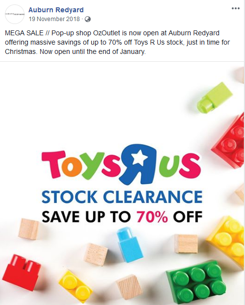 OzOutlet opened a pop-up shop at Auburn Redyard shopping centre. The pop-up is selling Toys R Us clearance stock at 70 per cent off. The pop-up opened in November and will trade until January.